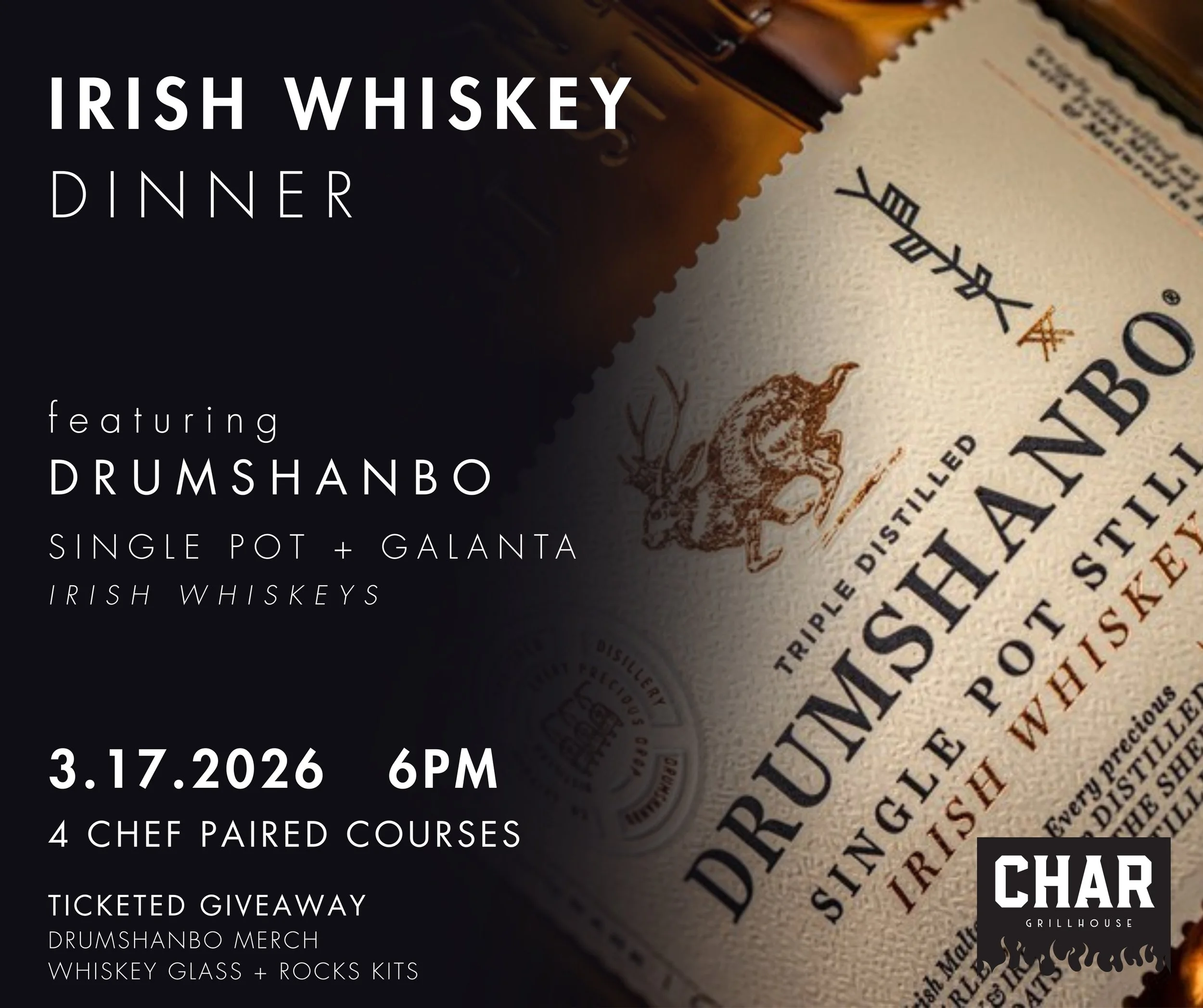 Irish Whiskey Dinner - Featuring Drumshanbo Tuesday, March 17, 2026 6:00 PM 11:00 PM Google Calendar ICS Make Reservation